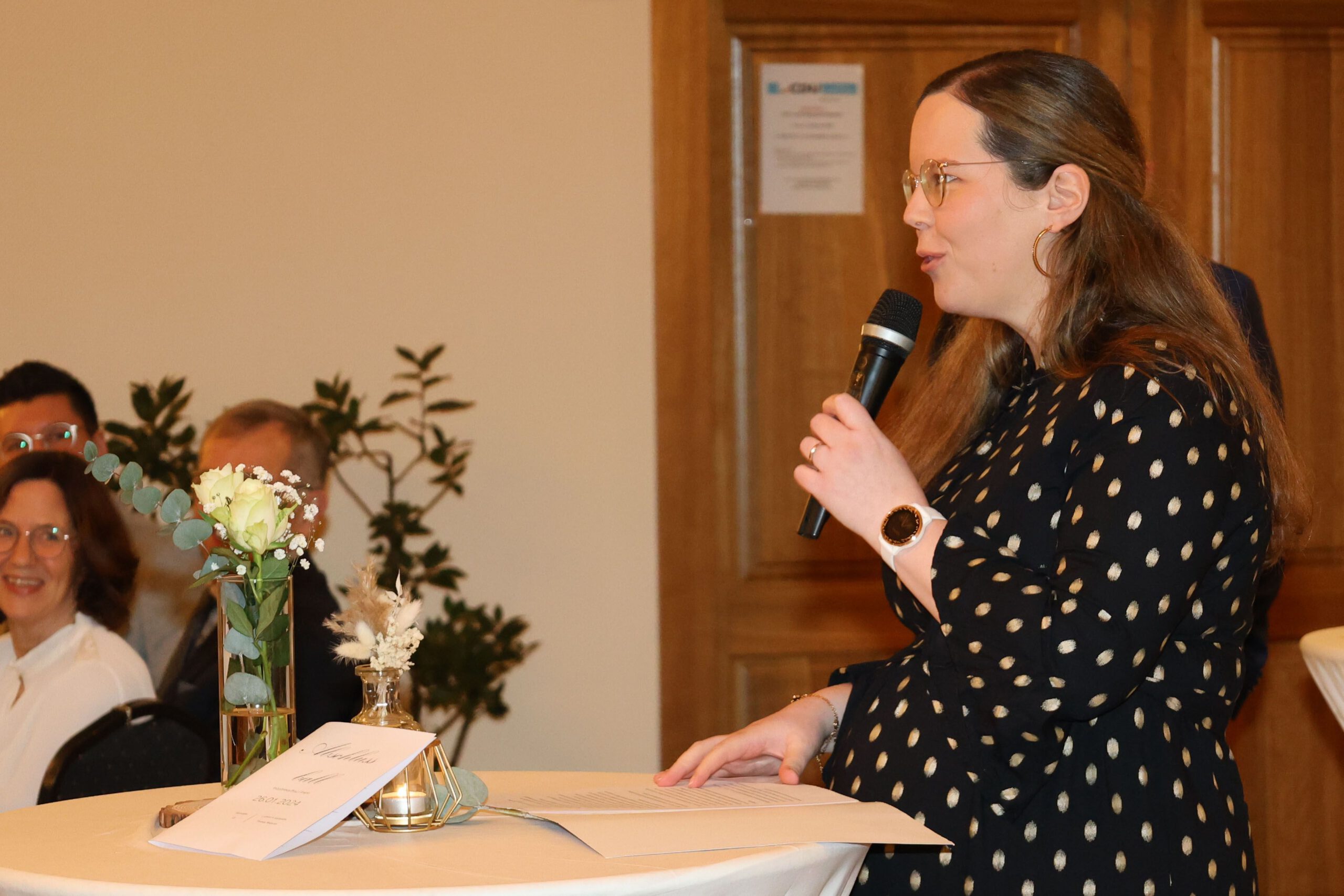 Als letzte Rednerin ließ die Klassenlehrerin Frau Cornelia Wolke die Ausbildungszeit Revue passieren. Sie erinnerte unter anderem an die besuchten Praxismodule bei den Firmen Tellmann in Essen, Schne-frost in Löningen und MIAVIT in Essen. Sie wünsche den AbsolventInnen für deren Zukunft einen Wechsel zwischen Vogel- und Froschperspektive – mal den Überblick zu behalten wie ein Vogel, mal die Nähe zu spüren wie ein Frosch. Insbesondere die Balance zwischen Vision und Realität, zwischen großen Zielen und kleinen Schritten zu erhalten, sei eine wichtige Eigenschaft für die Zukunft. Ein großes Dankeschön sprach Wolke den Organisatorinnen des Abends Jennifer Häring, Cristina Sitterberg und Pia Tellmann sowie dem Moderator Jan Schnieders aus.