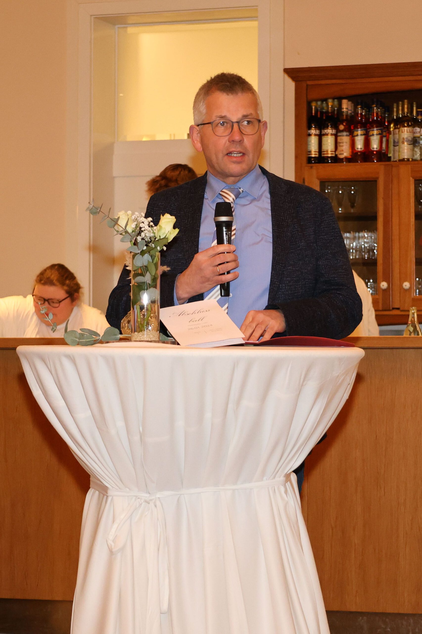 Weitere Gratulationen übermittelte Herr Jörg Bremersmann als Mitglied des Prüfungsausschusses der Oldenburgischen IHK. Im Hinblick auf die bedrohliche Weltlage betonte er besonders, wie wichtig es sei, als Team zu agieren und sich in Teams zu integrieren. Bereits während der Ausbildung haben sich die AbsolventInnen des Öfteren erfolgreich im Team bewiesen und sehr gute Ergebnisse erzielt. Kommunikation, Verantwortungsbereitschaft und Zusammenhalt sollten wichtige Eigenschaften sein, die sich die AbsolventInnen unbedingt bewahren müssten.